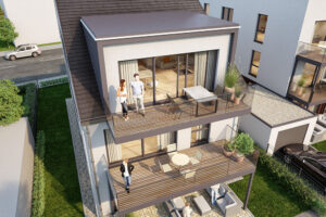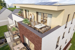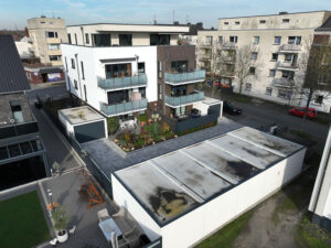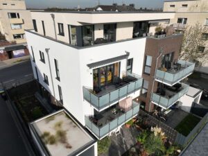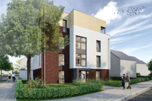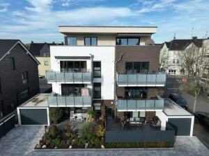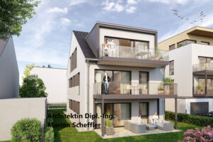 - Mehrfamilienhaus: Entwurf, Bauantrag inklusive Antragstellung zur Erteilung der Abgeschlossenheitsbescheinigung mit Veranlassung sowie Vorbereitung der Teilungserklärung durch den Notar,